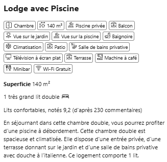Point central de cette expérience exclusive : votre piscine privée chauffée, idéale pour savourer chaque instant en toute intimité, à toute heure de la journée. La salle de bain, élégante et spacieuse, propose une douche à l’italienne ainsi qu’une baignoire, pour des instants de relaxation absolue.