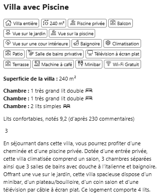 Avec ses 240 m² d’espace privé, la villa séduit par ses volumes généreux et son design élégant. Les intérieurs, entièrement équipés, mêlent lignes épurées et matériaux nobles inspirés de la nature réunionnaise, tels que la pierre de lave et le bois, créant une atmosphère chaleureuse et contemporaine. Chaque détail a été pensé pour le confort et la convivialité, dans un esprit résolument cinq étoiles.