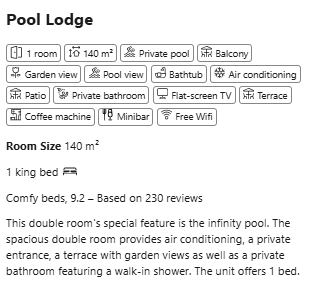 The lodge accommodates one or two guests and offers a soothing view of the garden. The bedroom features a king-size bed (200 x 200 cm), promising deeply restful nights. A separate indoor living room provides a peaceful retreat, while the outdoor lounge and spacious terrace extend moments of relaxation in the heart of nature.